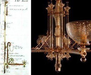 Registered design drawing next to detail of the Osler Chandelier in all it’s glory