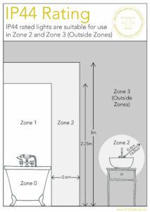 IP44 lighting is suitable for use in Zone 2 and Zone 3 (Outside Zones) – in other words, within 60cm from the edge of the bath and to a height of 2.25m from the floor. Note that inside a 60cm radius above a basin is also Zone 2 and requires fittings rated as IP44 or higher.