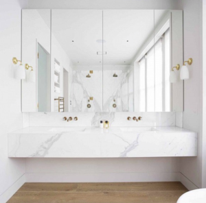 Matching our White Upton Glass Shades with large mirrors looks stylish and slick in this luxury and minimal bathroom design. The brass contemporary wall lights are stylishly placed on the sides of a large mirror, complementing the marble effect of the bathroom without obstructing the view.