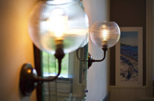 This stunning interior design snap, taken in the tiny market town of Ross-On-Wye, displays a skinny rib take on our popular Hereford Ribbed Glass Globe Contemporary Wall Light. Perfectly positioned to frame the hallway mirror, the wall lights are a charming addition to the décor.