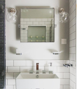 The Pixley bathroom wall light is a neat, elegant and simple contemporary fitting. Pictured here with a skinny ribbed glass shade, the symmetrically hung lights tastefully frame the large round mirror, creating ambience and providing extra illumination for the morning routine.