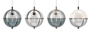 The various types of glass bring their own qualities to the design; the smoked glass accentuates the internal frosted horizontal disc. Within the white glass the hex bar profile is subtly seen like a cast shadow and the rim of the disc glows a light aqua. The skinny ribbed glass teases the eye as it slightly distorts the skeleton of The Grafton, but allows enough of the detail to be seen if you look closely. The clear glass celebrates every feature of the light including the filament of the LED lamp inside. The ribbed glass is elegant and adds another dimension to this sphere and the internal aspects are still visible. If you wish, you can choose 2 different types of glass as the top and bottom are separate domes and come together to make the globe – You could design your own planet!