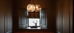 To illuminate the hallways between rooms, XXL Ledbury 3-way centre pendant lights hang on hook & chain pendant sets. These eye-catching lights are a pretty addition to the space.