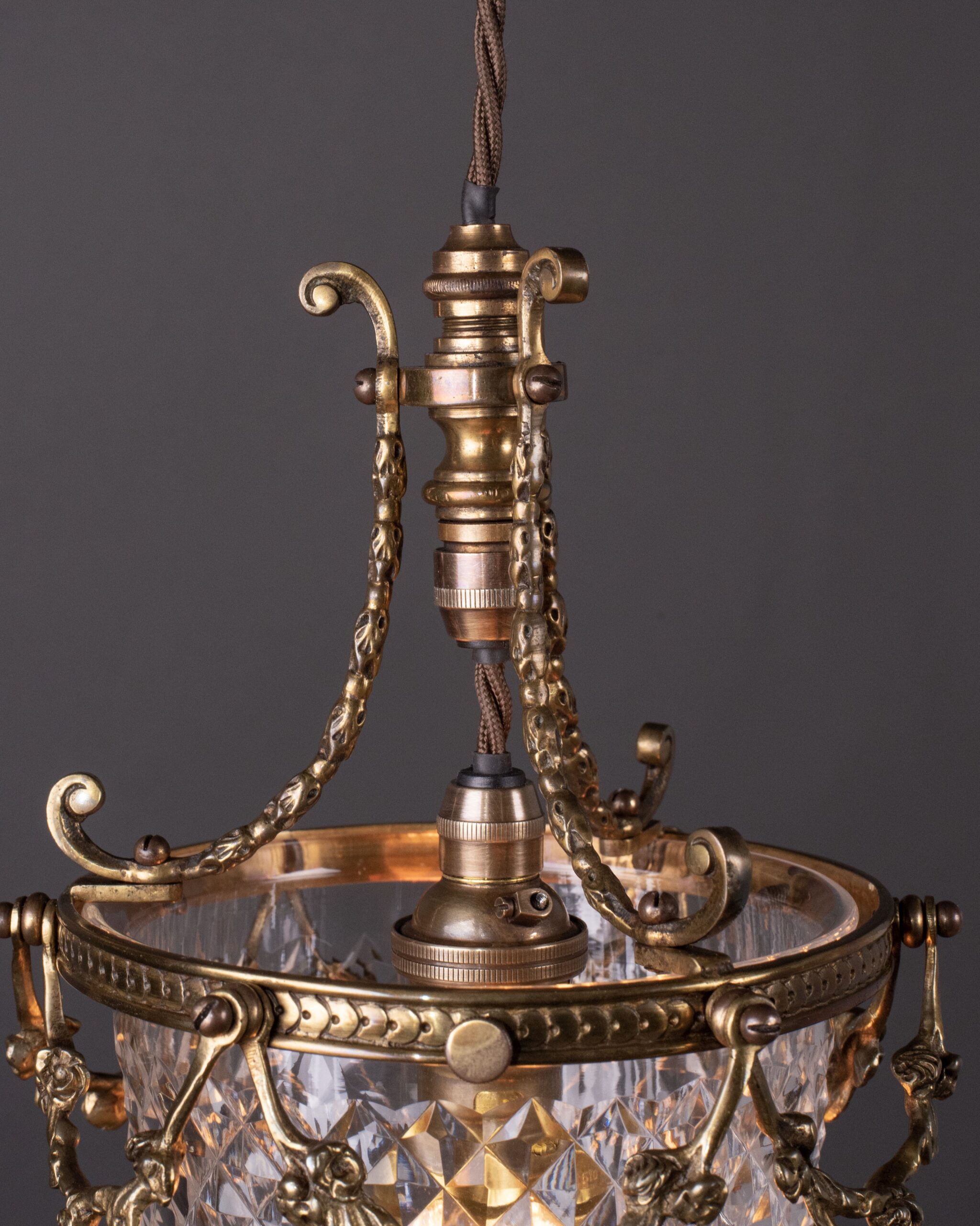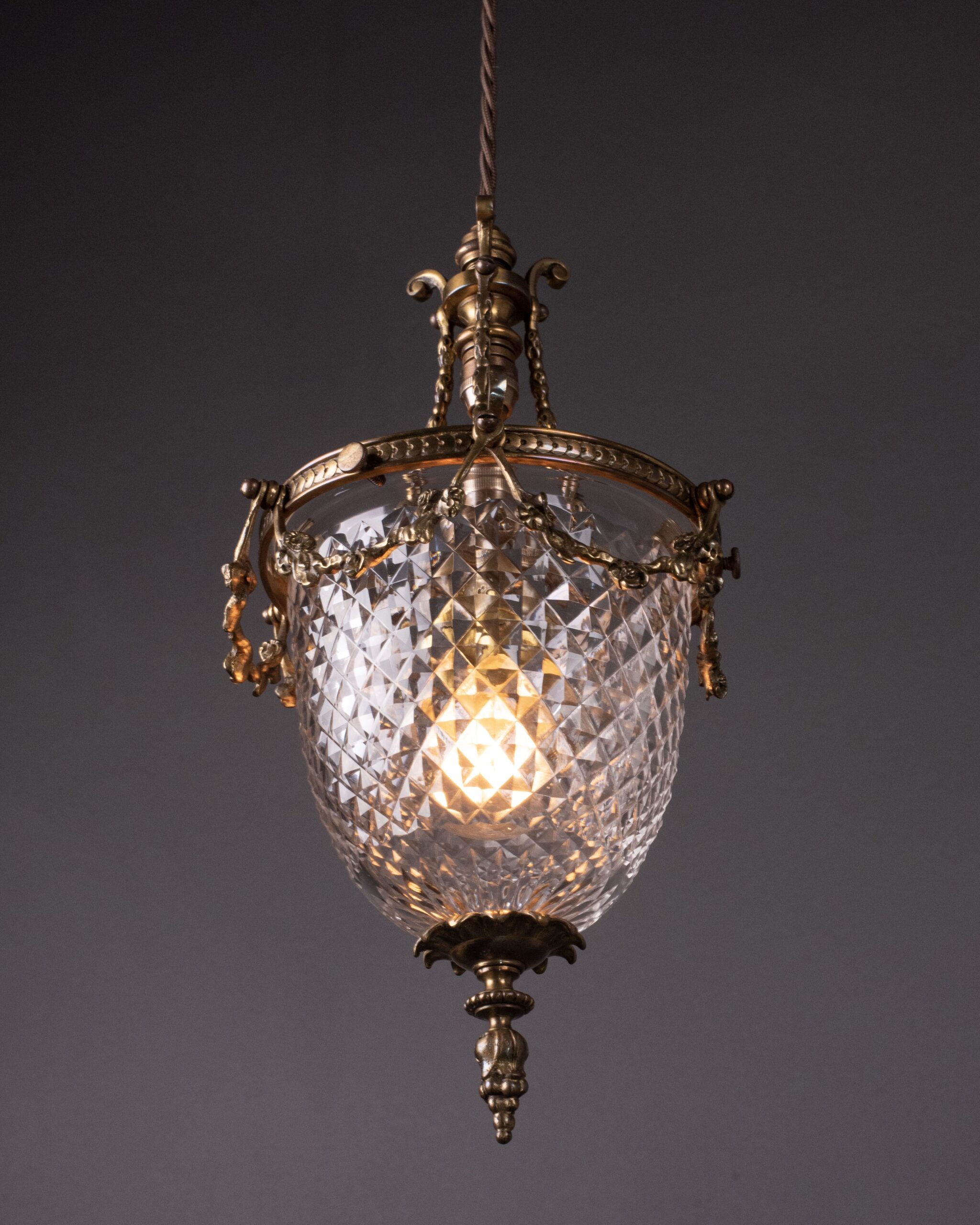 ,This Edwardian ceiling light has a natural aged brass patina and is supplied with dark brown flex. It features a cut-crystal shade made of hobnail glass which is surrounded with decorative cast brass swags. It is attributed to F&C Osler and unusually comes complete with its original ceiling plate.